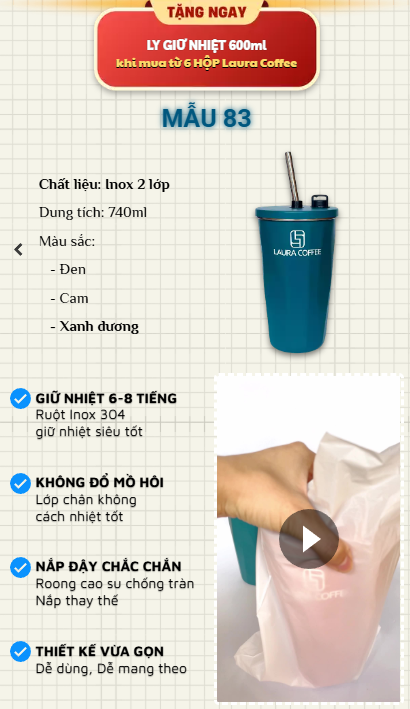 Điểm nổi bật của Laura Coffee là hương vị ngọt hậu tự nhiên, không đắng gắt, dễ uống và không gây "hồi hộp" như cà phê thông thường. Sản phẩm phù hợp cho cả nam và nữ, đặc biệt là phụ nữ văn phòng hoặc người không quen uống cà phê mạnh, giúp bạn pha chế nhanh chóng, tiện lợi mang theo mọi nơi.